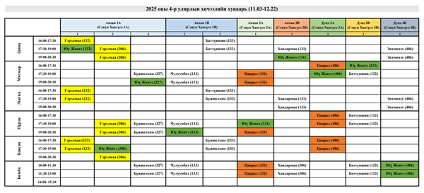 МУИС-ийн дэргэдэх Улаанбаатар 2 Сэжун Институтийн 2025 оны 2-р улирлын хичээлийн хуваарь